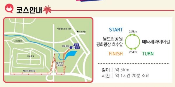 마포 둘레길 걷기 대회 코스는 약 5km 구간으로 월드컵공원 평화의 광장에서 시작해 서울에너지드림센터, 하늘공원 구름다리를 거쳐 메타세쿼이아 길을 반환점으로 다시 월드컵공원 평화의 광장으로 돌아오는 코스다.