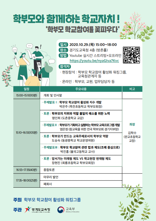토론회는 오후 3시부터 온라인과 오프라인으로 동시 개최하며 주제는 학부모 학교참여 활성화 지수 개발, 학부모가 기획하고 실행하는 학부모 교육 프로그램 개발, 학부모 학교참여 관련 법과 제도 등이다.