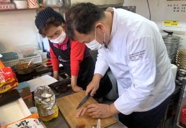 김태수 그랜드하얏트서울호텔 셰프는 ‘이모네’ 점포를 대상으로 차돌라면과 새우김밥 등 간편 조리와 배달이 가능한 한식 메뉴 개발을 돕는다.