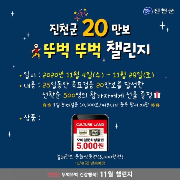 이번 11월 챌린지는 4일부터 오는 28일까지 25일간 진행되며 20만보를 달성한 진천군민 500명에게 모바일문화상품권 5천원권을 선착순으로 제공한다.