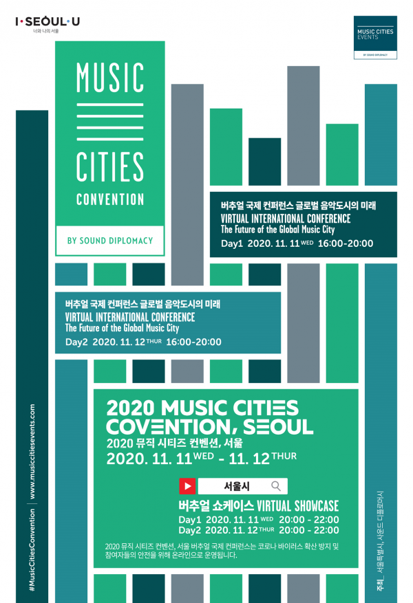 11일(수)~12일(목) 오후 4시부터 ‘글로벌 음악도시의 미래‘를 주제로 이틀간 진행되는 버추얼 국제 컨퍼런스는 남산골한옥마을 남산국악당에서 관객 없이 진행되며 뮤직 시티즈 컨벤션 홈페이지와 서울시 유튜브 채널을 통해 생중계된다.
