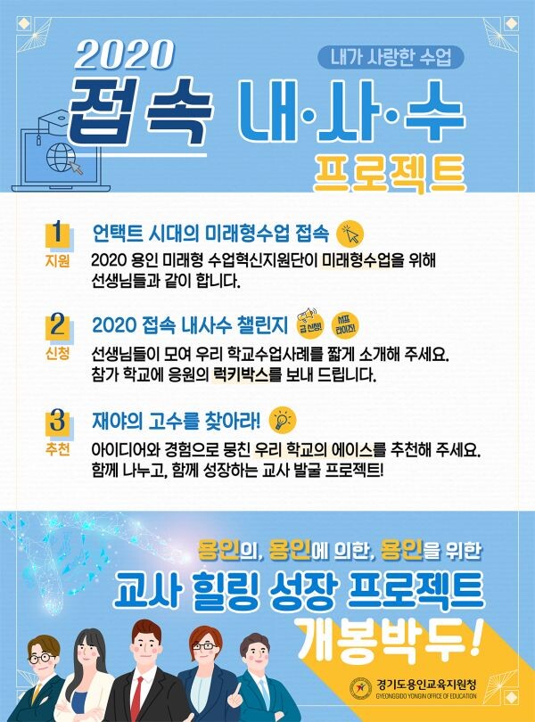 첫째, 언택트 시대의 미래형수업 접속은 2020 용인 미래형 수업혁신지원단이 코로나 19 이후의 미래형수업에 대해 관내 교사들을 지원하는 프로그램이다.