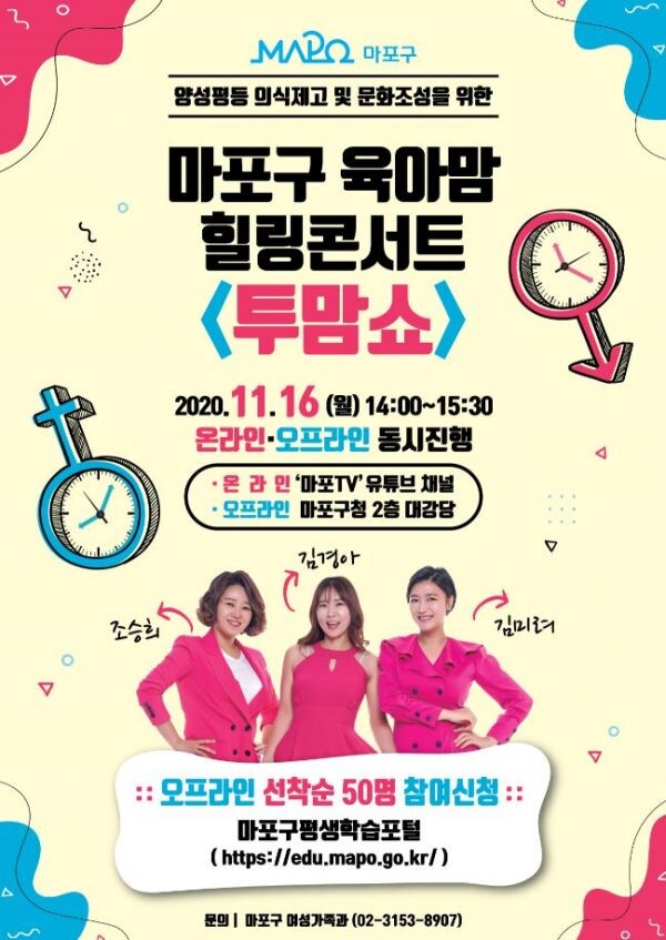 온·오프라인 동시진행으로 이루어질 ‘투맘쇼’는 마포구 공식 유튜브 채널에서 실시간 생중계될 예정이다.