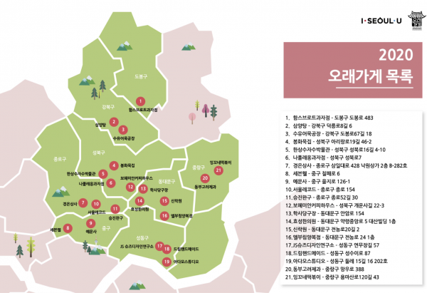 2020년 오래가게로 선정된 21곳은 성북구 4개소, 동대문구 4개소, 성동구 3개소, 강북구 2개소, 중랑구 2개소, 도봉구 1개소, 중구 2개소, 종로구 3개소 이다.