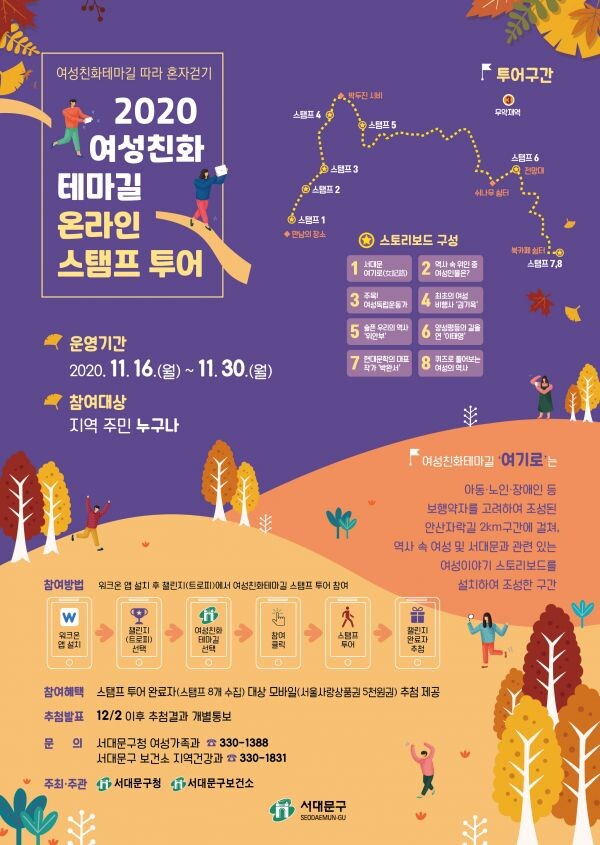문석진 서대문구청장은 “여성친화테마길 온라인 스탬프 투어가 ‘여성의 역사’에 대한 관심을 높임은 물론 자연 속에서 늦가을의 여유를 찾는 시간이 되길 기대한다”고 말했다.