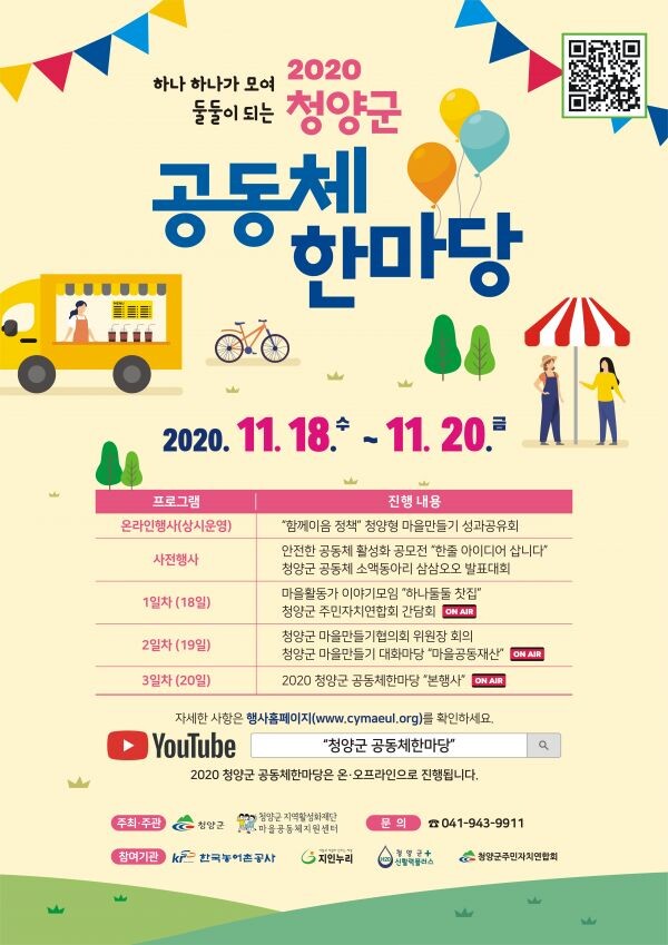 18일에는 청양읍 마을활동가 토론회와 남양면 행복나눔터 정담회가 열리고 19일에는 청양군마을만들기협의회 대화마당을 통해 ‘마을공동체 재산 및 활용방안’을 논의한다.