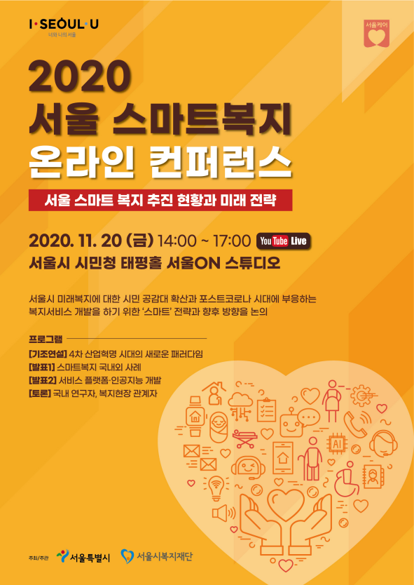 이러한 논의의 일환으로 시와 서울시복지재단은 ‘2020 서울 스마트복지 온라인 컨퍼런스’를 11.20. 오후 2시~오후 5시까지 ‘무관중·온라인’ 으로 개최한다고 밝혔다.