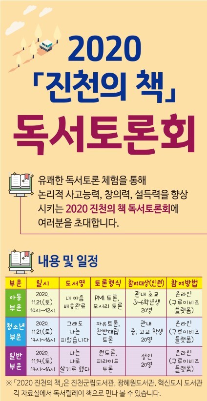 이번 독서토론회는 화상 플랫폼을 활용해 온라인으로 실시간 진행되며 올해 진천의 책으로 선정된 일반부문 아동부문 청소년부문 등 3개 분야 도서에 대해 토론회가 운영된다.