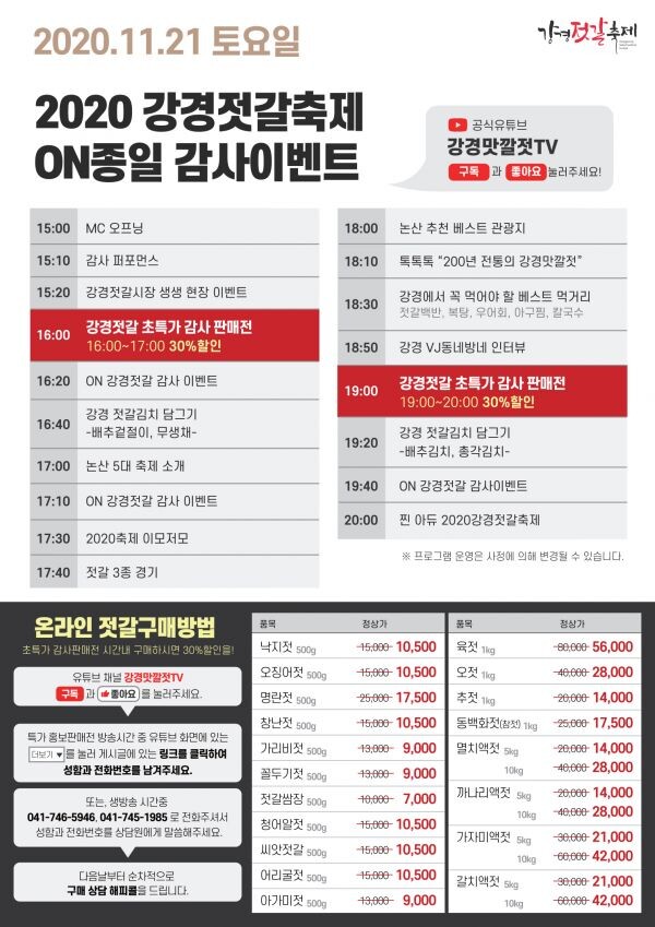 행사는 오는 21일 오전 11시부터 오후 8시까지 ‘강경맛깔젓TV’공식유튜브 채널에서 참여할 수 있으며 강경젓갈전시관 스튜디오, 젓갈공원, 젓갈시장 주변 등에서 온·오프라인 프로그램을 병행해 진행된다.