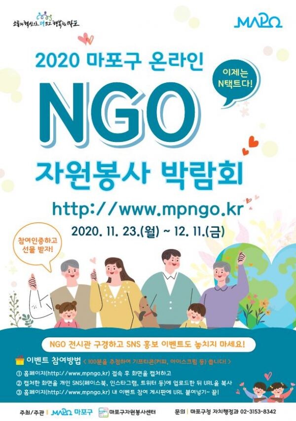 ‘2020 마포구 NGO 온라인 박람회’ 페이지는 23일 오전 10시 이후부터 12월 11일 오후 6시까지 스마트폰이나 태플릿, PC 등으로 관람할 수 있다.