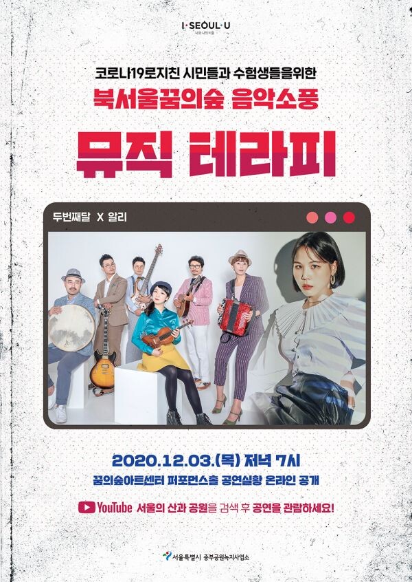 온라인으로 진행 될 ‘북서울꿈의숲 음악소풍 ‘뮤직테라피’’는 최고의 가창력으로 청중의 마음을 사로잡는 실력파 가수 ‘알리’와 다양한 장르와의 작업을 통해 독특하고 차별화된 무대를 선보이며 눈과 귀를 사로잡는 밴드 ‘두번째달’이 참여해 시민들과 수험생들에게 위로와 힐링의 무대를 선사할 예정이다.
