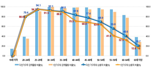 도시화의 영향으로 청년인구가 유입되던 1994년 이전은 1인 가구의 70%가 20·30대였으나, 고령화에 따라 2015년 이후 1인 가구는 40대 이상이 50%를 넘어서 계속 증가하고 있다.