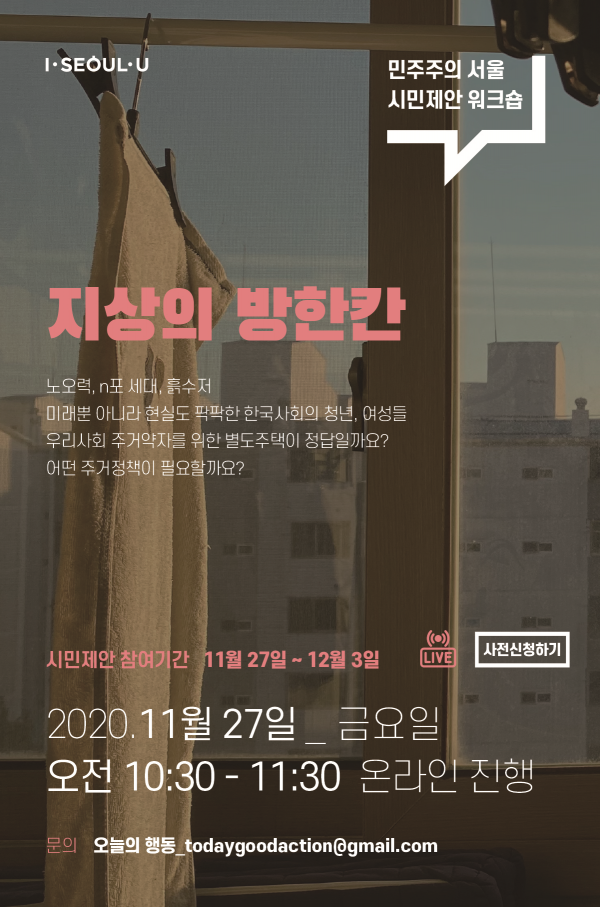 조미숙 서울민주주의담당관은 “청년 주거에 대한 청년들의 생각을 직접 들어볼 수 있는 좋은 기회가 될 것” 이라며 “청년들이 실제로 느끼는 불편함이나 필요하다고 생각하는 정책들을 민주주의 서울을 통해 많이 제안해 주길 바란다”고 밝혔다.