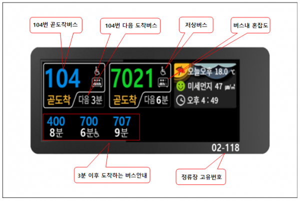 기존 단말기는 메인화면에 버스노선별로 나열한 뒤 도착시간, 저상버스 표시가 제공되고 하단에 곧 도착 버스와 혼잡도가 함께 제공되고 있다.