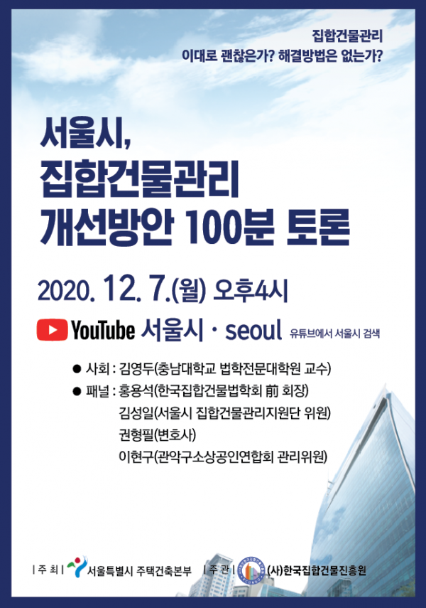 7일 오늘 진행되는 ‘집합건물 개선방안을 위한 온라인 100분 토론회’는 코로나 19로 변화된 환경에 맞춰 비대면 방식으로 지정 유튜브을 통해 실시간 생중계되어 모바일로 어디서든 시청할 수 있다.