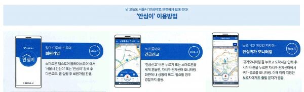 ‘안심이’ 시스템이란 지역 내 설치된 CCTV와 자치구 관제센터를 스마트폰 앱으로 연계해 모니터링을 실시, 앱 가입자에게 위기 상황이 발생한 경우 이를 실시간으로 파악하고 대응할 수 있도록 하는 시스템이다.