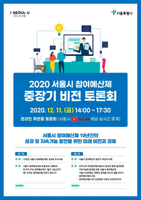 ‘10년간 서울시 참여예산제의 성과와 우수사례’라는 주제로 발표할 예정이고 서울민주주의위원회 우지영 위원, 강명옥 위원, 나라살림연구소 김상철 연구원, 더 이음 이호 대표가 토론자로 참여한다.