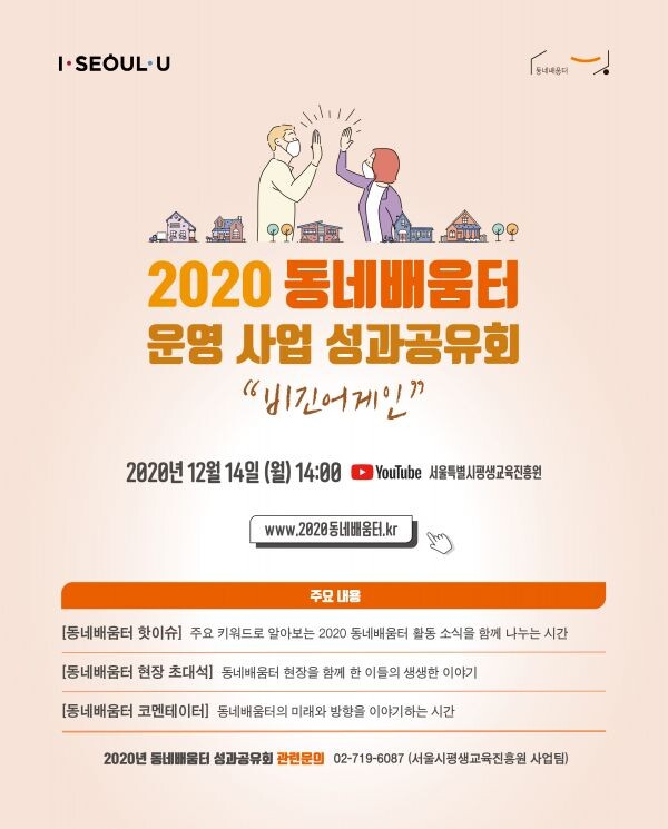 소상공인에게 응원의 메시지를 캘리그라피로 전하는 ‘강사도 배움을 채우는 곳, 동네배움터’, 비대면 프로그램으로 새로운 변화를 경험한 ‘내 나이 76세, 줌으로 새로운 세상을 만나다’, ‘동네배움터에서 학습 공백기 없이 한국어 공부하다’ 등의 영상이 소개된다.