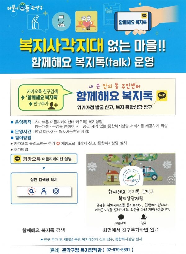 박준희 관악구청장은 “포스트코로나 시대 주민 간 사회관계가 축소되고 비대면 상담이 요구되는 절실한 시점에 ‘함께해요 복지톡’ 등 다양한 경로의 비대면 서비스를 준비해 더욱 촘촘하게 복지 사각지대 없는 관악 조성에 최선을 다하겠다”고 말했다.
