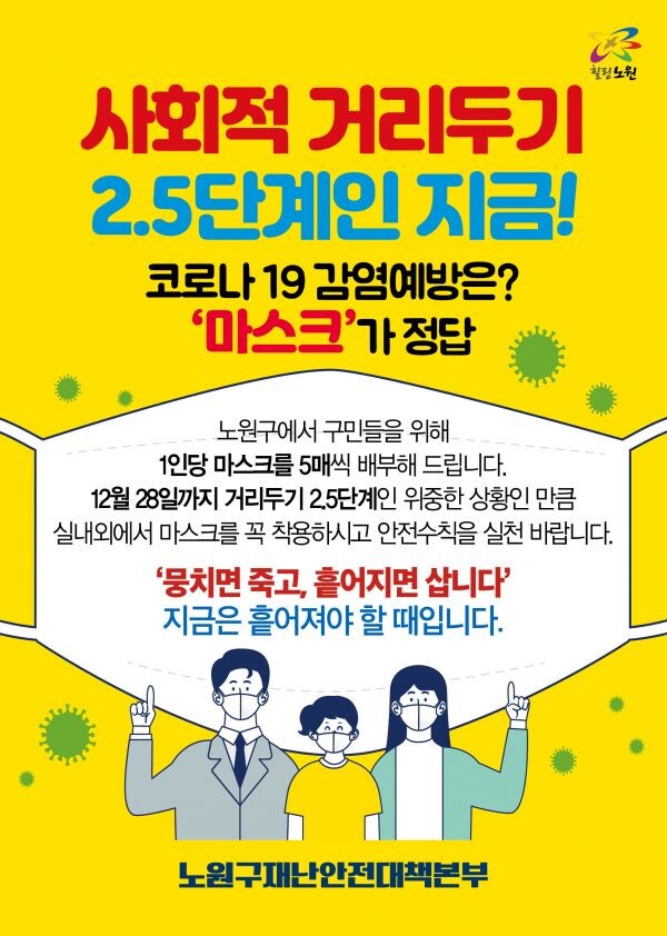 오승록 구청장은 “마스크 착용은 가장 쉽고 확실한 방역수단으로 비용 대비 효과가 높다는 것이 여러 사례를 통해 증명됐다”며 “실내외 마스크 착용을 생활화하고 연말연시 기간 집에 머물며 사회적 거리두기에 적극 동참해 주실 것을 당부 드린다"고 말했다.