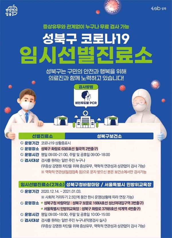 성북구 코로나19 임시선별진료소는 2021년 1월 3일까지 운영하며 상황에 따라 연장 가능하다.