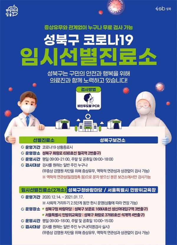 이승로 성북구청장은 “코로나19 재확산 방지를 위해 모든 행정력을 집중하고 있으나 방역대책과 함께 구민의 자발적인 참여가 절대적으로 필요한 상황”이라고 강조하면서 “연말연시 5인 이상의 소모임을 자제하고 모두의 건강과 안전을 위해 코로나19 선제검사에 적극 동참”을 거듭 당부했다.