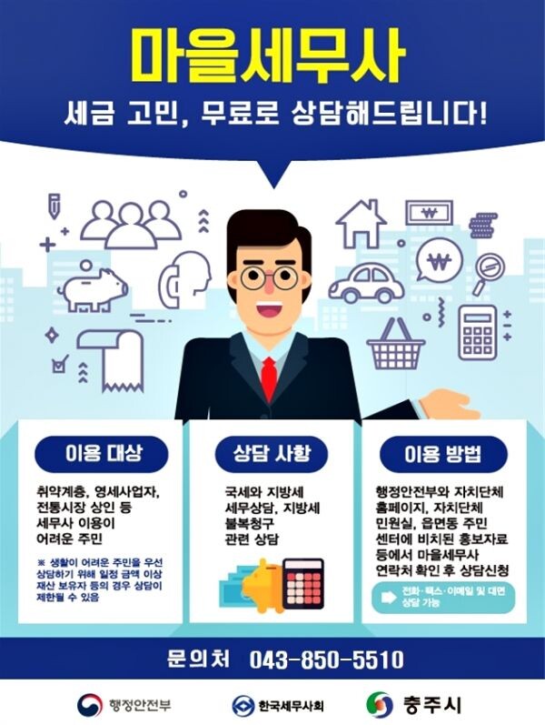 ‘충주시 마을세무사’는 재능기부를 원하는 세무사들의 신청을 받아 주민들의 어렵고 복잡한 세금 고민을 무료로 상담해 주는 제도이다.