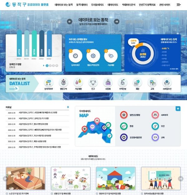 ‘공공데이터 플랫폼’에서는 우리동네 지도, 데이터 지도, 빅데이터 분석결과, 민선7기 정책 지표 등 기관별로 흩어져 있던 동작구 관련 자료를 모아 총 116종 2만여 건의 데이터를 통합 제공한다.