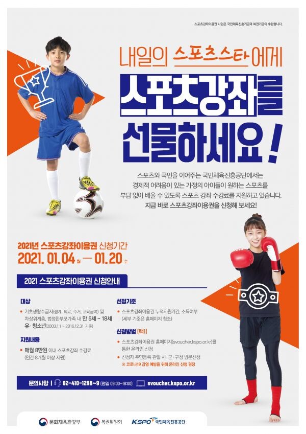 스포츠강좌이용권은 저소득층 유·청소년들의 스포츠 참여기회 확대를 통해 체력향상과 건강 증진에 도움을 주는 사업으로 대상자에게는 매월 8만원의 범위 내에서 연간 8개월 이상 태권도·검도·에어로빅 등 다양한 스포츠 강좌 수강료를 지원한다.