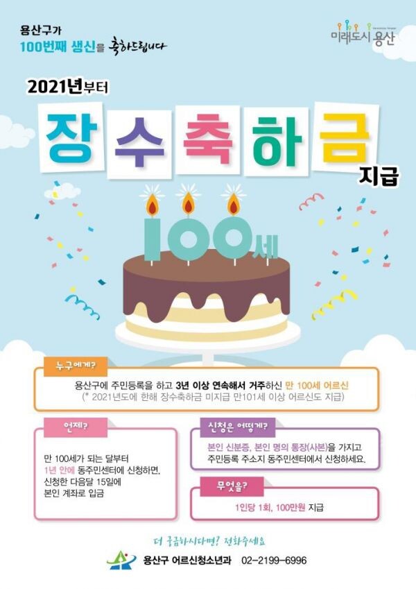 지급대상은 용산구에 주민등록을 하고 3년 이상 연속해서 거주해 온 어르신으로 만 100세가 된 해에 축하금을 1회 지급한다.