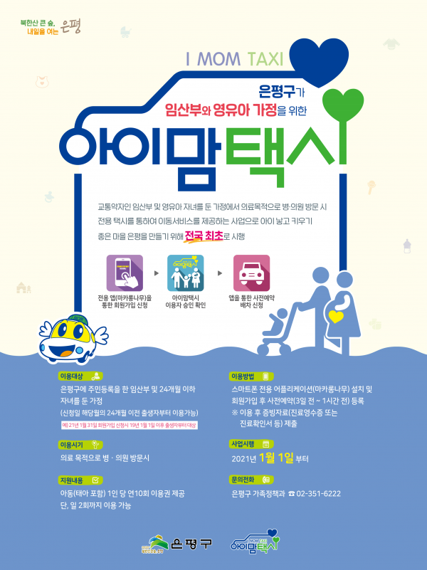 김미경 은평구청장은 “아이맘택시 사업은 임신 및 영유아 동행으로 대중교통 이용이 불편한 가정의 이동편의를 도와 아이낳아 키우기 행복한 은평을 만드는 데 크게 기여해, 은평구와 우리나라의 출산율 증가에도 도움이 될 수 있도록 아이맘택시가 전국으로 사업이 확대되었으면 좋겠다”고 전했다.