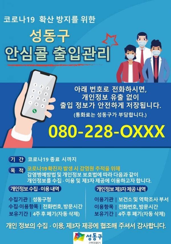 구는 지난 달 24일부터 올해 1월 8일까지 성동구청사 1층 출입구와 지하1층 출입구에 통화 한 번으로 전자출입명부를 대체할 수 있는 안심콜 출입관리 서비스를 임시 운영했다.
