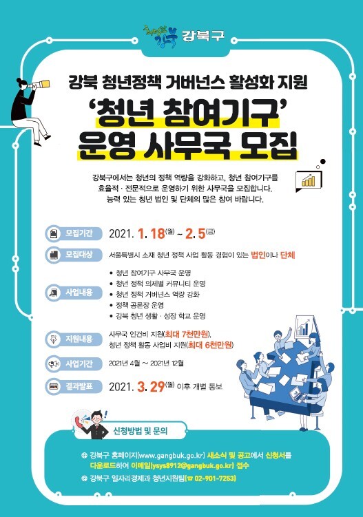 박겸수 강북구청장은 “생생한 생활밀착형 청년정책을 도출하기 위한 필수 절차가 바로 운영사무국 선정 단계다“며 “지역 내 역량 있는 청년 조직들의 많은 관심과 참여가 있기를 바란다”고 말했다.