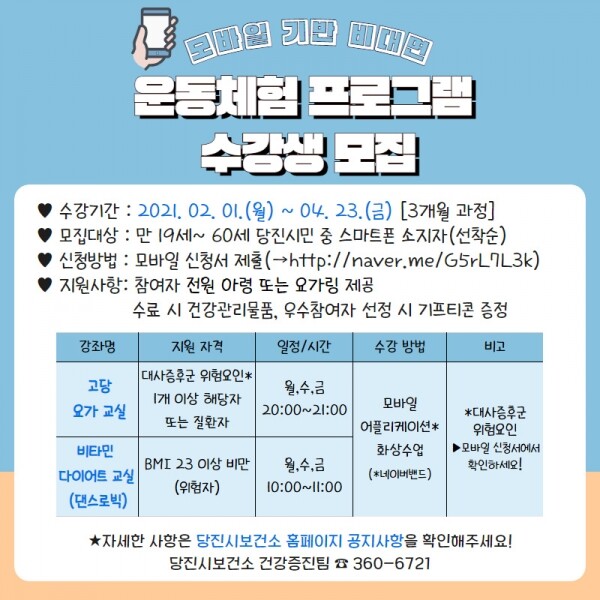 지원 자격으로는 만 19세 ~ 60세 당진시민 중 스마트폰 소지자로서 ‘고당 요가교실’은 대사증후군 위험요인 1개 이상 해당자, ‘비타민 다이어트 교실’은 BMI 23 이상 비만자이다.