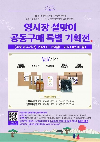 채현일 영등포구청장은 “‘설맞이 온라인 공동구매’를 통해 물품을 구입하면 코로나19로 침체된 지역경제도 살리고 주민분들께서는 편리하고 안전하게 구매할 수 있어 일석이조의 효과를 볼 수 있다”며 “올 설에는 온라인 전통시장에서 필요물품을 구매하며 이웃 간 정도 나누고 지역경제도 살리는 착한소비에 동참해주실 것을 부탁드린다”고 전했다.