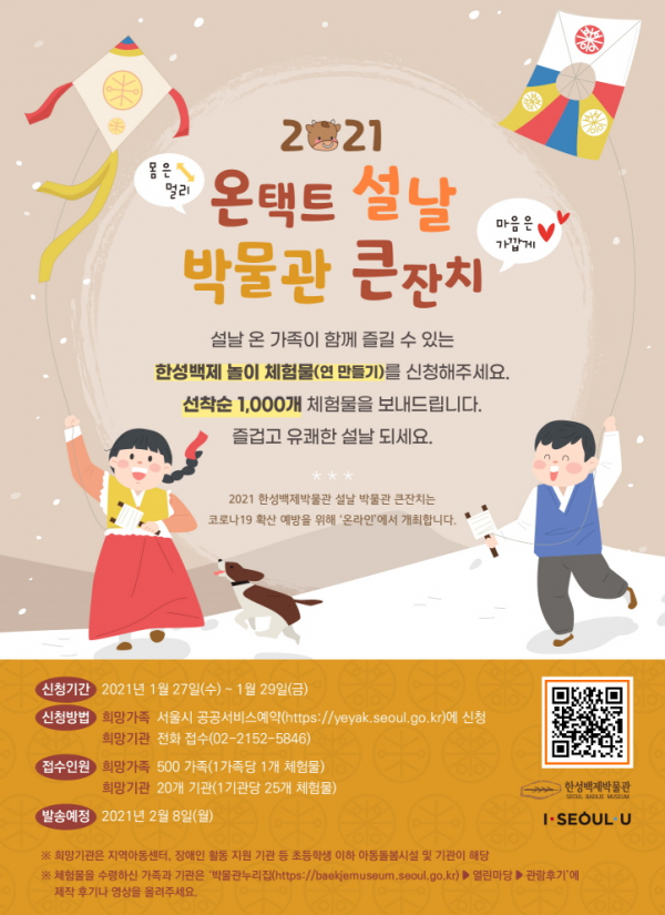 매년 설날을 맞아 박물관 마당과 로비에서 개최해온 행사를 이번에는 코로나19 확산 예방을 위해 온택트 방식으로 진행하며 설날 온 가족이 함께 즐길 수 있는 한성백제 놀이 체험물은 온라인과 전화로 접수를 받아 사전 배포한다.