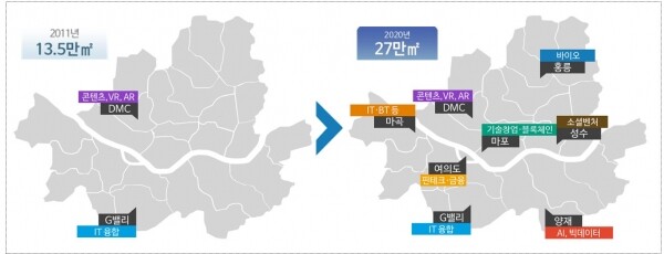 창업 인프라의 경우 공공기관 이전부지와 유휴부지를 권역별 산업 거점으로 전환, '11년 DMC와 G밸리 2곳에 불과했던 창업 클러스터가 '20년 말 현재 홍릉 바이오, 양재AI, 마곡첨단산업단지 등 서울 전역 8곳으로 확장됐다.