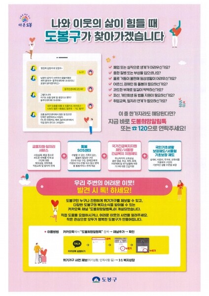 도움이 필요한 주민은 카카오톡 검색창에 ‘도봉희망알림톡’ 을 검색한 뒤 친구추가 후 1:1 복지상담을 요청하면, 동 복지플래너가 신속히 상담해 급여 및 서비스 연계, 사례관리대상자로 선정하는 등 맞춤형 지원이 이뤄진다.