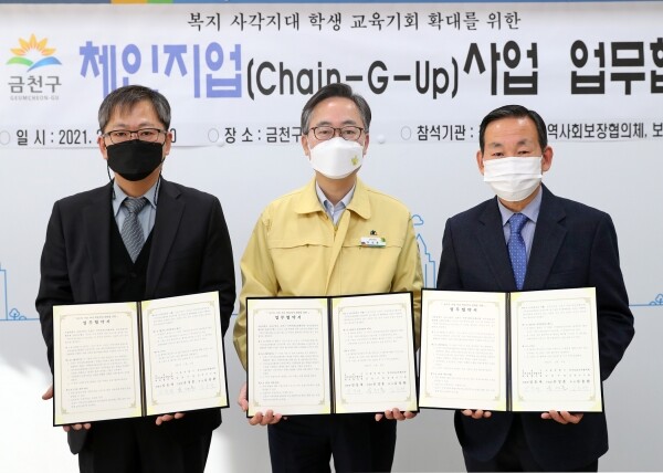 협약식에는 유성훈 구청장, 임동채 금천구 지역사회보장협의체 대표협의체 위원장, 김용환 전국보습교육협의회 금천지구회장이 참석해 원활한 사업 추진을 위해 적극 협력해 나갈 것을 약속했다.