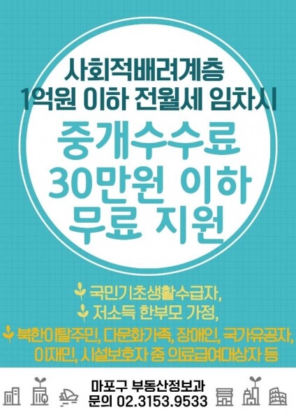 이는 지원대상자가 전·월세 보증금 1억원 이하 주택 임차 시 부동산중개수수료를 30만원까지 지원하는 사업으로 지난 2019년 6월부터는 국민기초생활수급자 소득하위 일부에서 범위를 확대해 국민기초생활수급자 전체를 지원했으며 저소득 한부모가정을 신규 지원하기도 했다.
