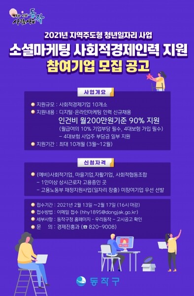 모집대상은 디지털 기술을 활용한 온라인 마케팅 홈페이지 제작·관리 비대면 고객지원 업무 등을 실시하는 관내 사회적기업, 마을기업, 자활기업, 사회적협동조합, 온라인 마케팅 일자리 채용 희망기업 총 10개소이다.