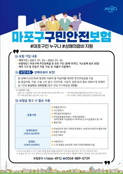 전 구민을 대상으로 운영되는 ‘마포구 구민안전보험’은 등록 외국인, 거소등록 동포를 포함해 마포구에 주민등록이 되어 있는 모든 구민이 별도의 가입절차 없이 자동으로 가입되며 보험가입 기간 중 발생한 사고라면 발생일로부터 3년 내 보험청구를 할 수 있다.