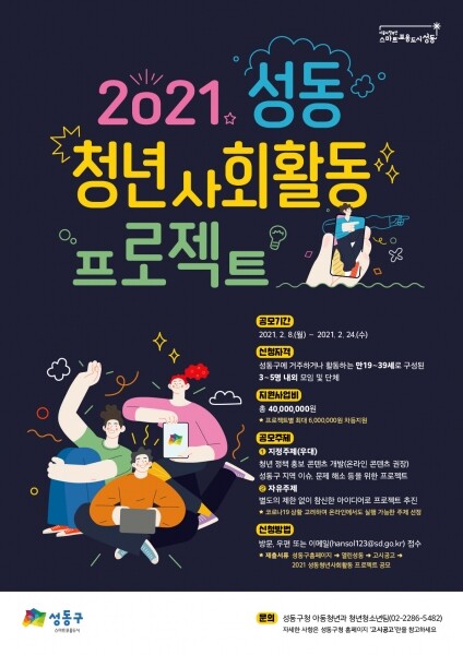 신청대상은 성동구 거주 만 19세~39세 청년으로 구성된 3~5명 내외 모임 및 단체이며 프로젝트 당 최대 6백만원으로 차등 지원되며 총 4천만원 규모로 진행된다.