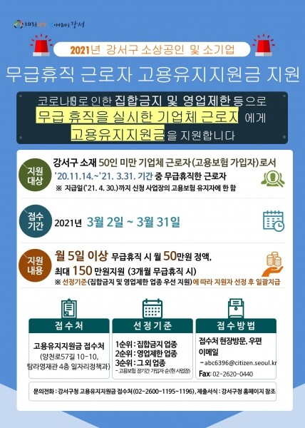 지원대상은 강서구 소재 상시근로자 50인 미만 기업체에 근무하며 고용보험에 가입된 근로자 가운데 2020년 11월 14일부터 2021년 3월 31일까지의 기간 중 월 5일 이상 무급휴직을 실시한 근로자이다.