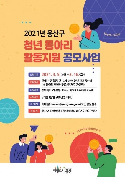 공모 대상은 용산구에 거주하고 있거나 생활권이 용산구인 만 19세에서 39세까지 청년으로 구성된 단체나 모임이다.