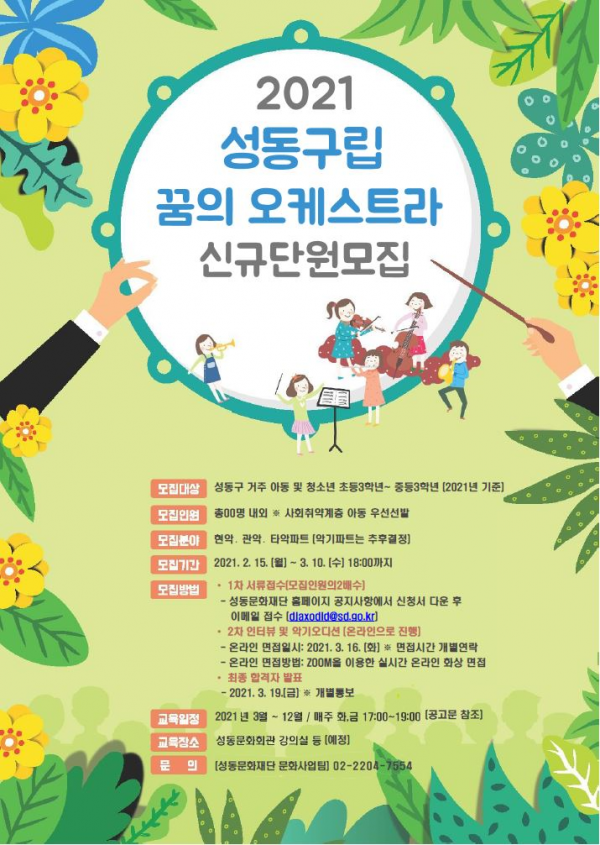 이번 신규단원 모집은 성동구에 거주하는 초등 3학년 ~ 중등 3학년의 아동·청소년을 대상으로 오케스트라 교육에 참여할 의지가 있는 사회 취약 계층을 우선 선발한다.