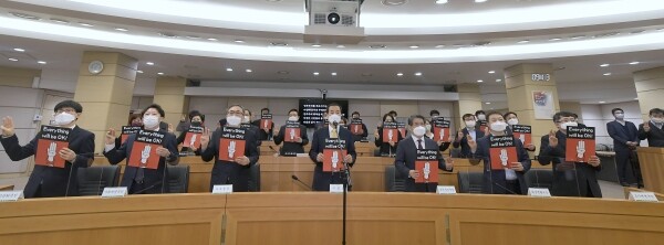 9일 오전 구청 3층 대회의실에 모인 구 간부 직원들은 ‘민주주의 회복을 위해 군부에 맞서고 있는 미얀마 국민들의 저항을 지지한다’며 ‘미얀마 군부는 무력 사용을 중단하고 아웅산 수치 국가고문을 비롯한 정치인과 관계자들을 즉각 석방해 문민정부로의 복귀를 이행하라’고 촉구했다.