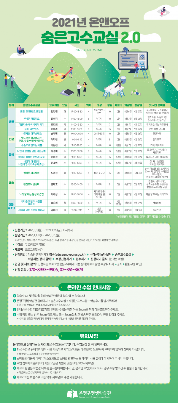 ‘온앤오프 숨은고수교실 2.0’은 코로나19 상황 속에서도 주민들의 학습 기회를 지속적으로 보장하기 위해 온·오프라인 병행 학습체제로 지역의 숨은고수들이 가진 재능을 이웃에게 나누는 배움의 장이다.
