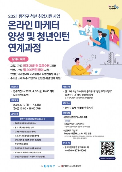이에 동작구가 오는 12월까지 청년 30명을 대상으로 SNS, 유튜브 등 온라인 마케팅 전문가를 양성해 기업 인턴 근무를 통한 직무 경험을 제공하고 취업을 연계하는 프로젝트를 추진한다고 18일 밝혔다.