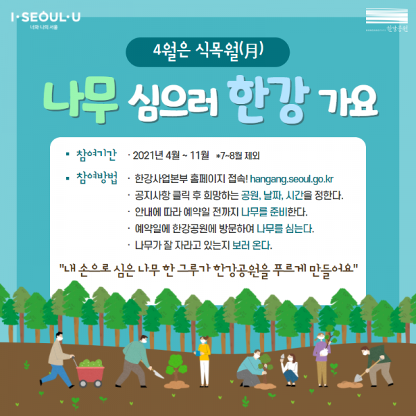 나무 심기는 누구나 신청을 통해 참여할 수 있으며 4월부터 11월까지, 매주 목요일 뚝섬·여의도·이촌·잠실한강공원의 지정구역에서 진행된다.